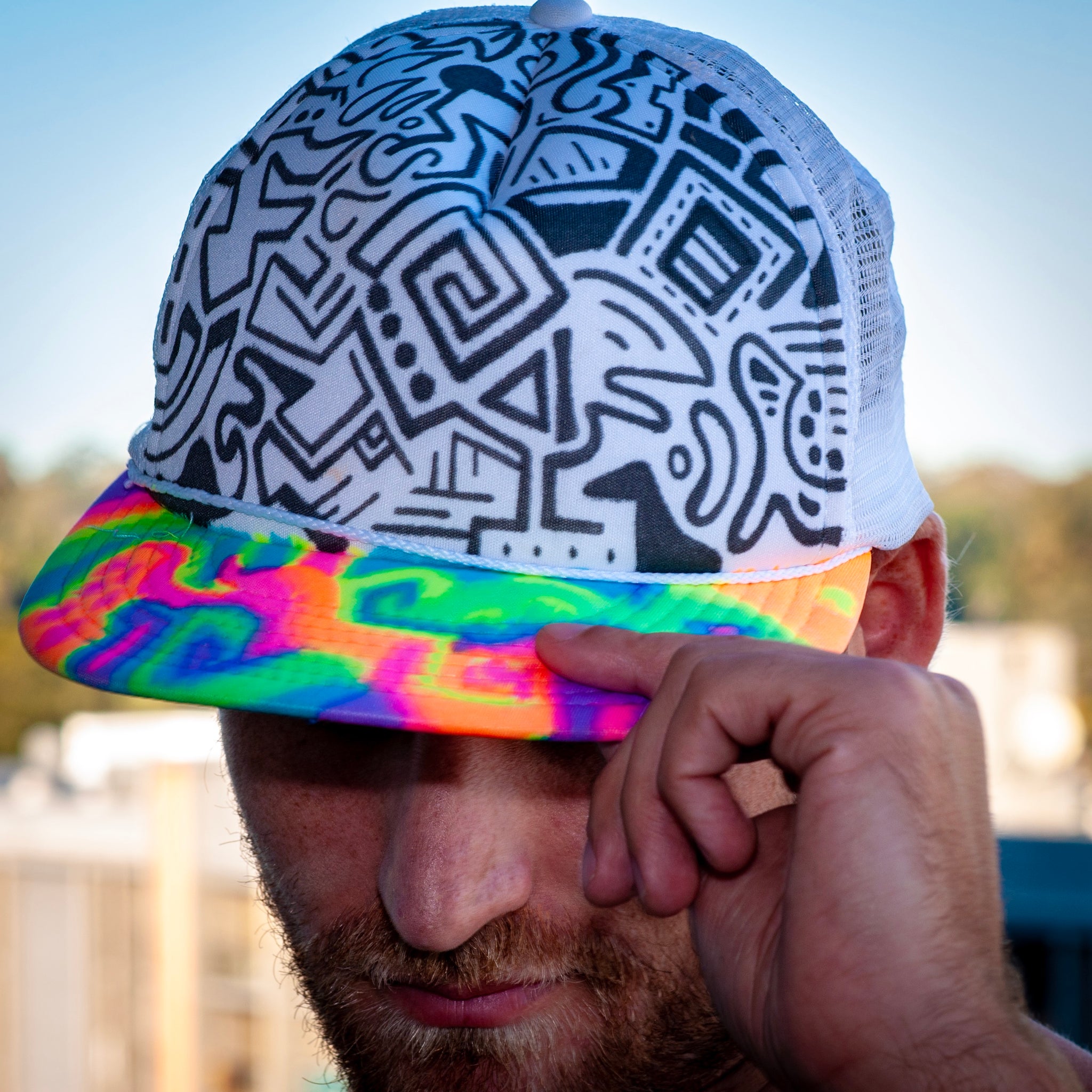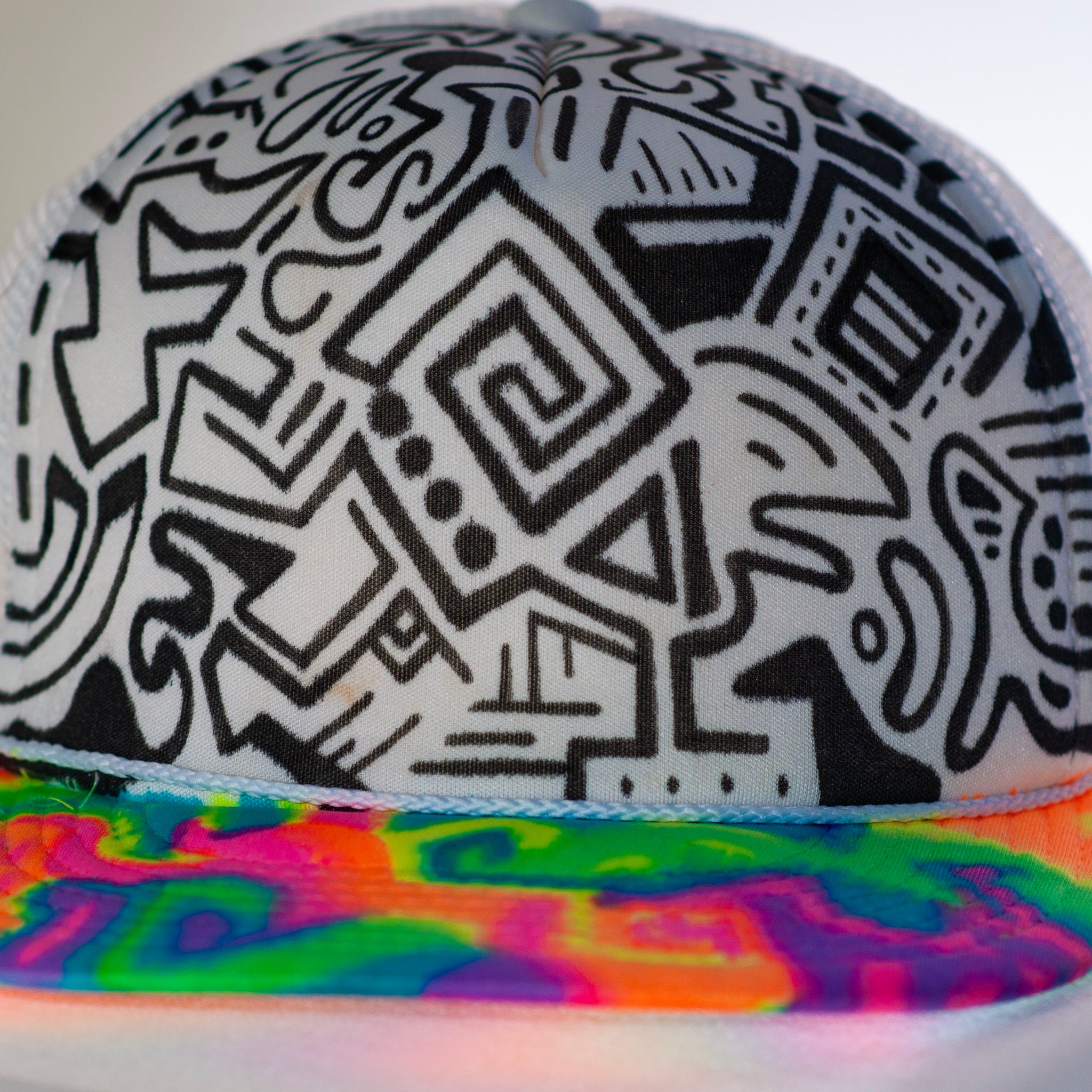 This mesh 'trucker-style' snapback hat is wearable art. Hand drawn with fabric marker by artist Jake Reif.