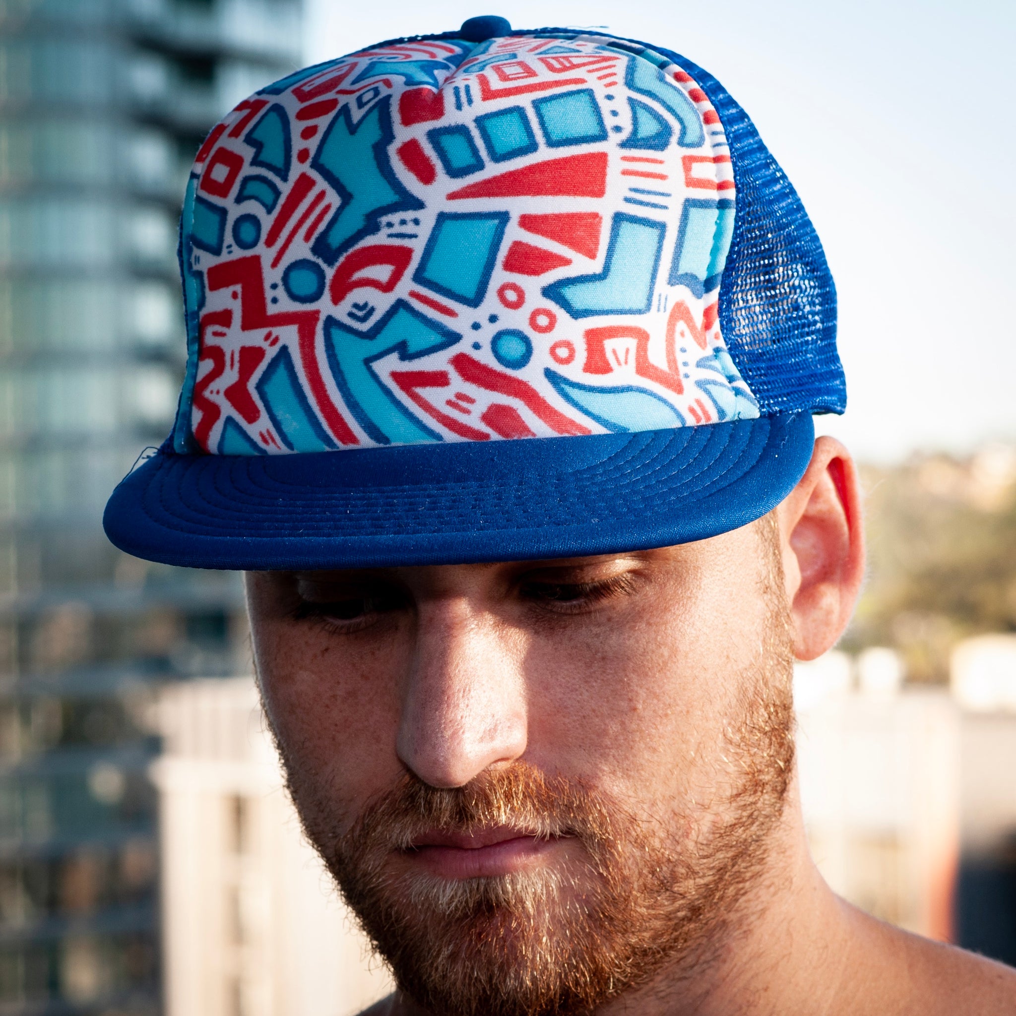 This mesh 'trucker-style' snapback hat is wearable art. Hand drawn with fabric marker by artist Jake Reif.