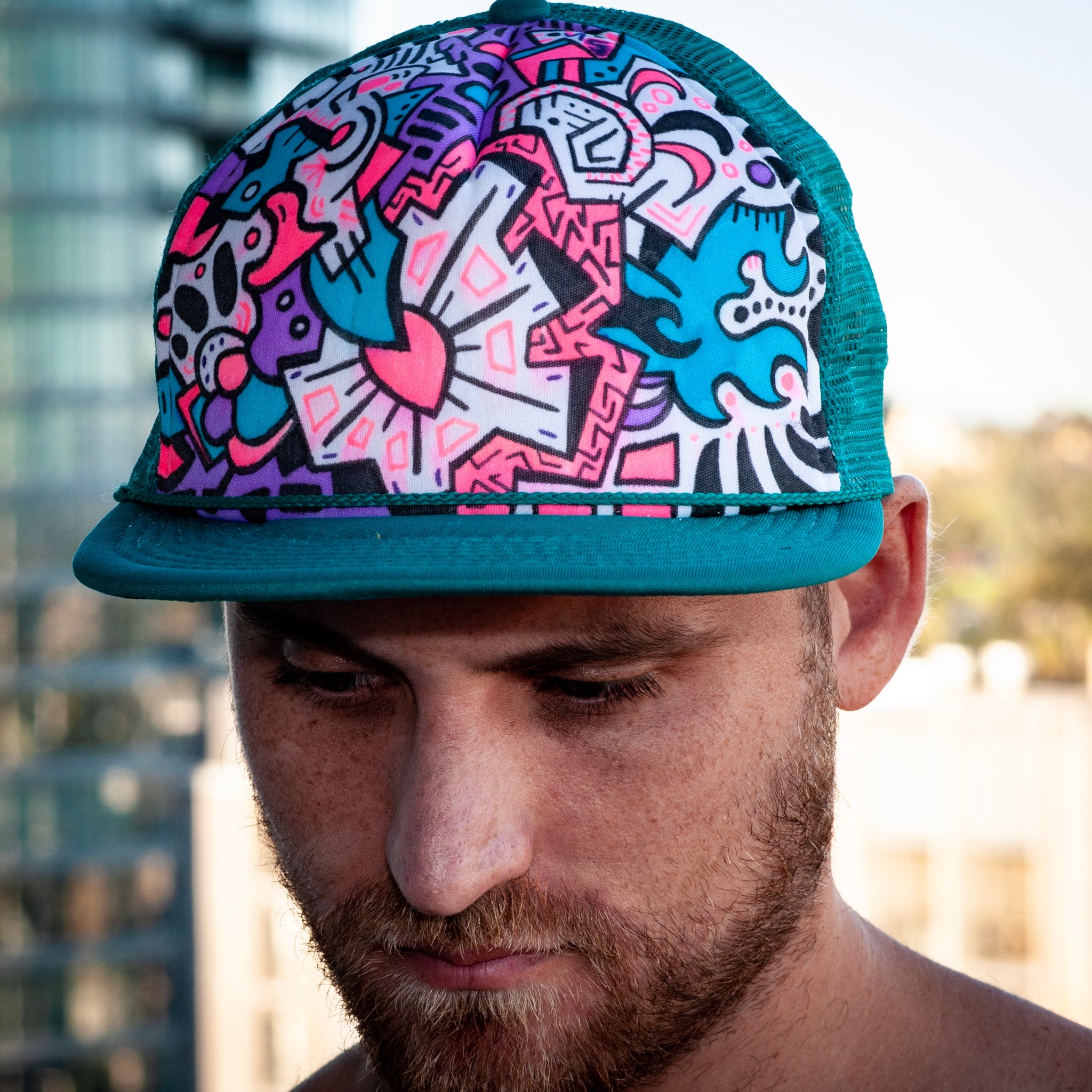 This mesh 'trucker-style' snapback hat is wearable art. Hand drawn with fabric marker by artist Jake Reif.